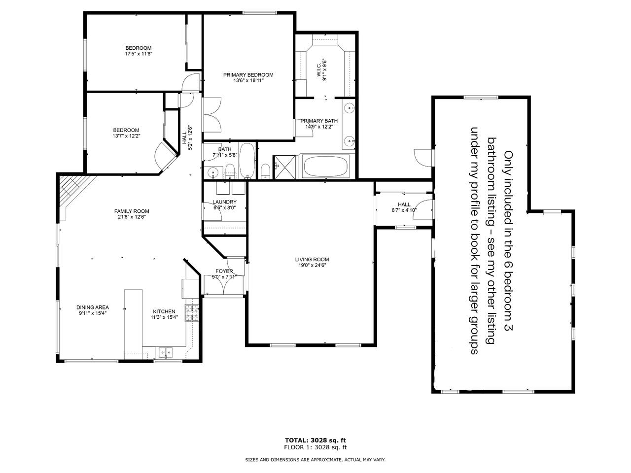 Traveling with a larger group (8+ guests)? The 6-bedroom / 3-bath version of this home unlocks the 3 additional bedrooms and 1 additional bathroom shown on the floor plan, giving your group even more space to spread out. Message me and I’ll happily help you book the right setup!